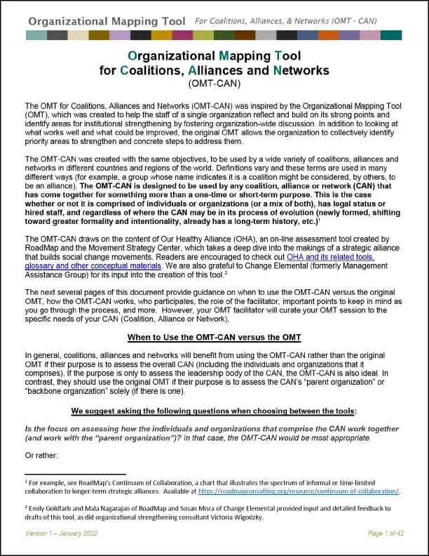 To meet the needs of coalitions, alliances and networks—which face unique challenges when it comes to strengthening their institutions and their partnerships with other groups—we have also created a version of the OMT to better serve them. While we know definitions vary and these terms are used in many ways, this version is intended to be used by a variety of coalitions, alliances and networks in all parts of the world to help them assess their priorities in key areas like composition and structure, joint action, and network resources.
